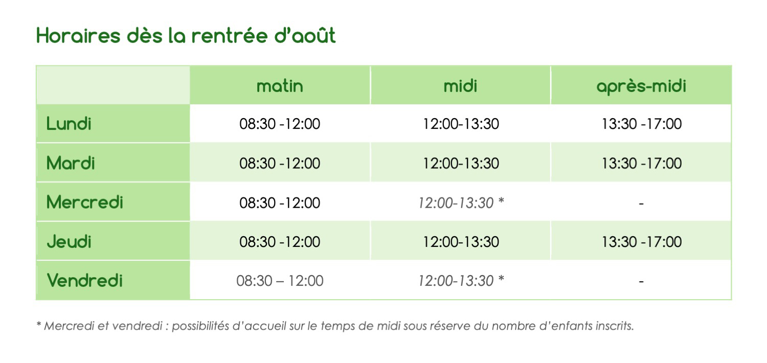 Les enfants sont accueillis pour la demi-journée ou pour la journée complète (8h30-17h00).