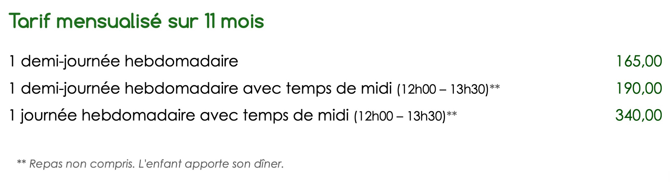 Les inscriptions se font en principe pour l'ensemble de l'année scolaire mais il est possible de s'inscrire à tout moment, dans la limite des places disponibles, pour une ou plusieurs demi-journée/s ou journée/s par semaine.